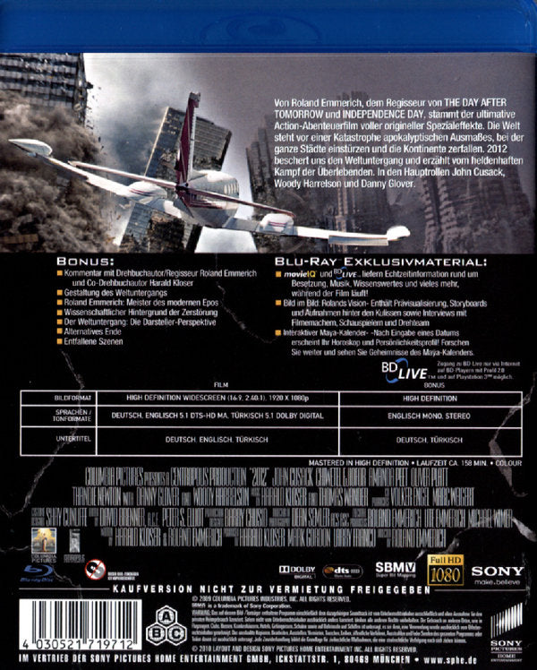 Enthält: Kommentar mit Drehbuchautor/Regisseur Roland Emmerich und Co-Drehbuchautor Harald Kloser; Gestaltung des Weltuntergangs; Roland Emmerich: Meister des modernen Epos; Wissenschaftlicher Hintergrund der Zerstörung; Der Weltuntergang: Die Darsteller-Perspektive; Alternatives Ende; Entfallene Szenen; BD-Live; Movie IQ; Bild-im-Bild; Interaktiver Maya-Kalender;