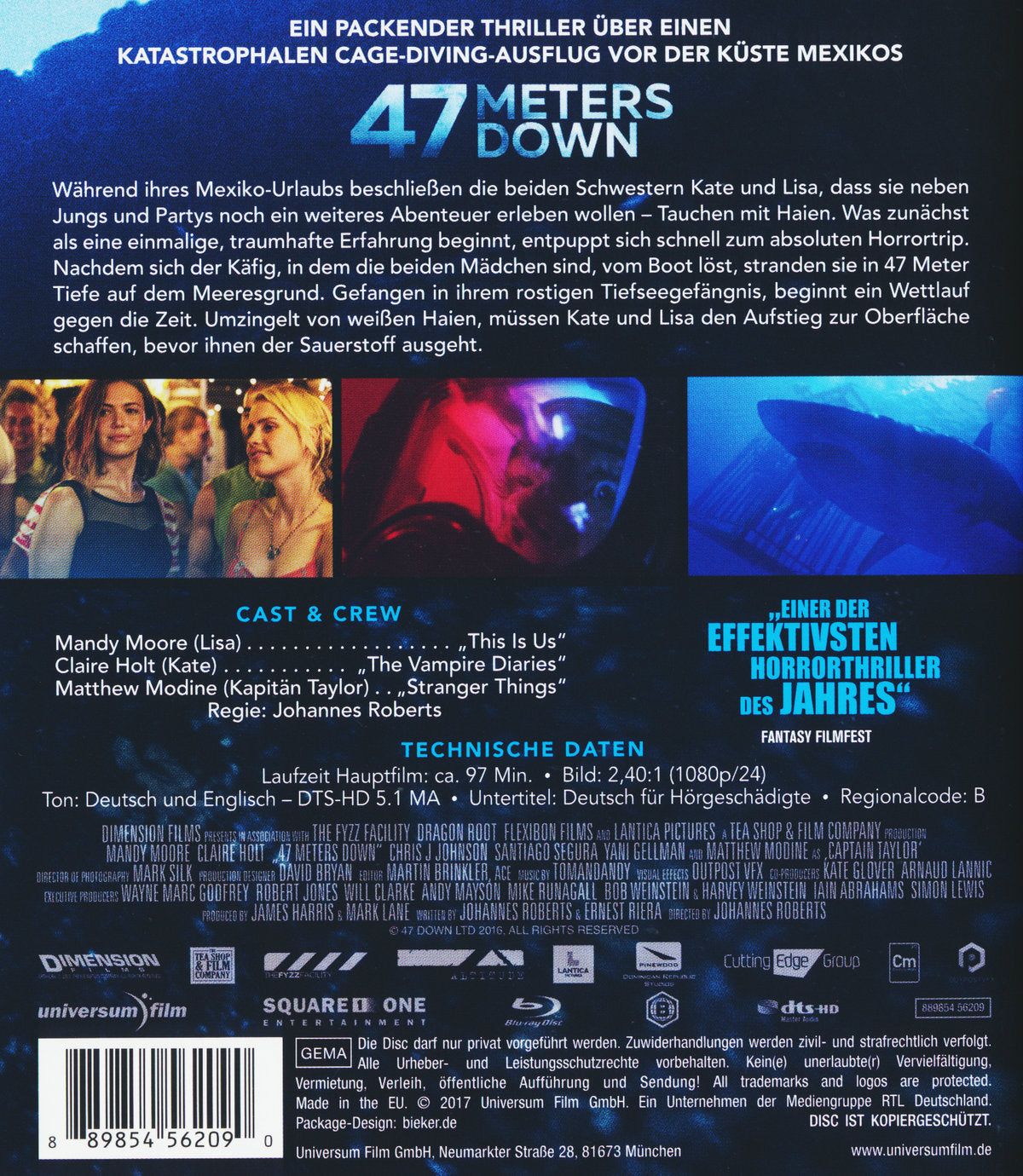 Hai-Alarm im Tropenparadies! Eigentlich wollten Kate und Lisa bei ihrem Mexikotrip einfach nur die Sau rauslassen und sich vielleicht noch einmal selbst beweisen, dass sie keine Langweiler sind. In feuchtfröhlicher Feierlaune entscheiden sich die beiden dann vor Ort aber natürlich genau für die falschen Jungs, den falschen Ausflug und das falsche Boot, um ein wildes Abenteuer zu erleben. Was als Käfigtauchgang runter zu einer Gruppe zähnefletschender Haie beginnt, wird so schnell vom Urlaubshighlight zum Horrortrip ihres Lebens. Denn - ihr ahnt es - 47 Meter unter dem Meeresspiegel stranden unsere Mädels und sitzen in ihrem rostigen Tiefseegefängnis fest.
