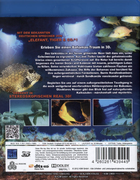 Erleben Sie einen Bahamas-Traum in 3D. Das türkisblau in der Sonne glitzernde Meer lädt dazu ein, seine Geheimnisse zu ergründen. Aus den Tiefen taucht der geheimnisvolle Umriss eines gesunkenen Schiffsriesen auf. Die Natur hat bereits damit begonnen die leeren Decks und Kabinen mit neuem, prächtigem Leben zu füllen. Seine verwinkelten Hohlräume bieten zahllosen Fischen ein willkommenes Zuhause. Die Riffe der Bahamas sind berühmt für ihre außergewöhnlichen Formationen. Bunte Korallenbonbons liegen verstreut - durch Sandkanäle voneinander getrennt. Begleiten Sie uns auf einem außergewöhnlichen Tauchgang in die noch weitgehend unerforschten Höhlensysteme der Bahamas. Glasklares Wasser gibt den Blick frei auf naturgeformte Kalksäulen -märchenhaft und mysteriös.