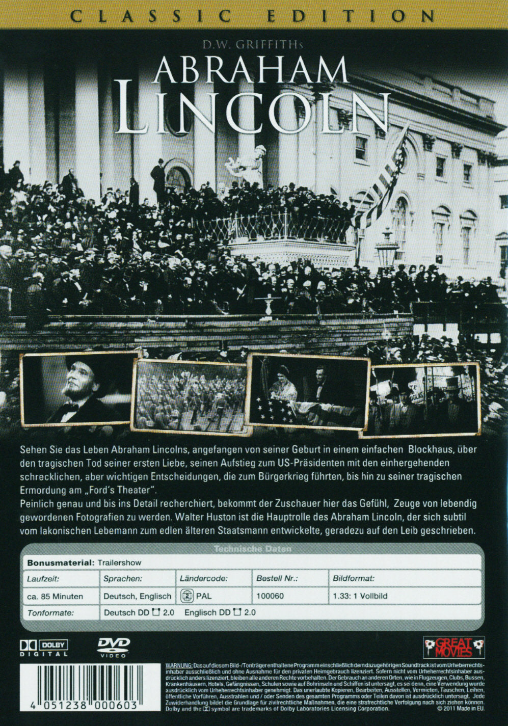 Sehen Sie das Leben Abraham Lincolns, angefangen von seiner Geburt in einem einfachen Blockhaus, über den tragischen Tod seiner ersten Liebe, seinen Aufstieg zum US-Präsidenten mit den einhergehenden schrecklichen, aber wichtigen Entscheidungen, die zum Bürgerkrieg führten, bis hin zu seiner tragischen Ermordung am "Fords Theater". Peinlich genau und bis ins Detail recherchiert, bekommt der Zuschauer hier das Gefühl, Zeuge von lebendig gewordenen Fotografien zu werden. Walter Huston ist die Hauptrolle des Abraham Lincoln, der sich subtil vom lakonischen Lebemann zum edlen älteren Staatsmann entwickelte, geradezu auf den Leib geschrieben.