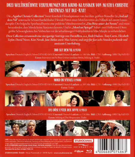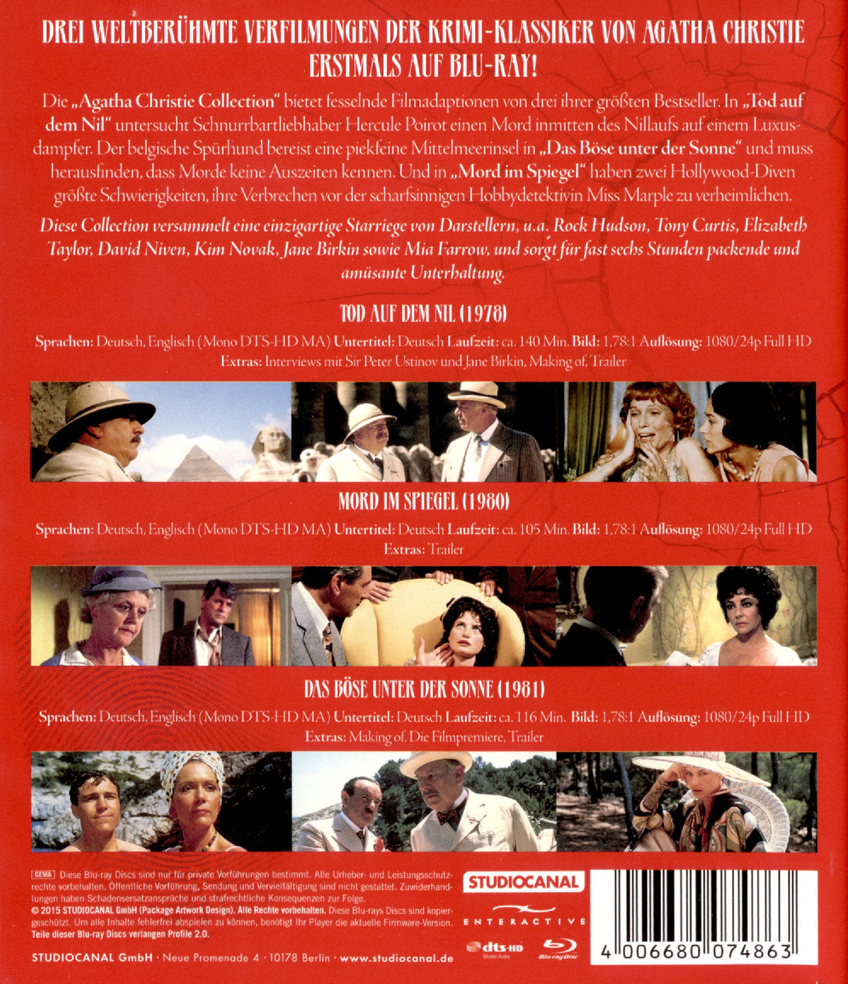 Die AGATHA CHRISTIE COLLECTION enthält vier fesselnde Filmadaptionen von den größten Bestsellern der britischen Autorin auf DVD. In „Tod auf dem Nil“ untersucht Schnurrbartliebhaber Hercule Poirot einen Mord inmitten des Nillaufs auf einem Luxusdampfer. Der belgische Spürhund bereist eine piekfeine Mittelmeerinsel in „Das Böse unter der Sonne“ und muss erkennen, dass Morde keine Auszeiten kennen. In „Mord im Spiegel“ haben selbst zwei Hollywood-Diven größte Schwierigkeiten ihre Verbrechen vor der scharfsinnigen Hobby detektivin Miss Marple zu verheimlichen und im raffinierten Psychothriller „Mord nach Maß“ zerstört ein angeblich verfluchtes Grundstück das junge Glück eines Paares.