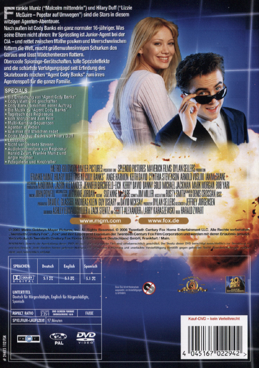 Enthält: Die Entstehung von Agent Cody Banks; Tagebuch des Regisseurs; Agent im Training; Wie man mit Mädchen redet; Coole Make-Up Tricks von Hilary Duff; Nicht verwendete Szenen; Audiokommentare von Frankie Muniz; Codys Welt wird geschaffen; Cody Banks bekommt einen Auftrag; Die Musik zu Cody Banks; Vom Storyboard zum Film; Multi-Kamera-Sequenzen; Agent in Aktion; Leseprobe; Ausgemusterte Szenen; Fotogalerie; Kinotrailer;