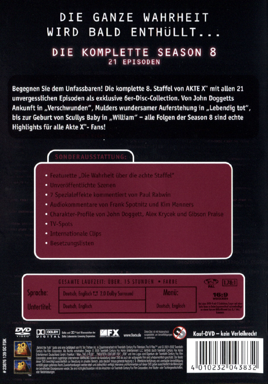 Enthält: Featurette "Die Wahrheit über die achte Staffel"; Unveröffentlichte Szenen; 7 Spezialeffekte kommentiert von Paul Rabwin; Audiokommentare von Frank Spotnitz und Kim Manners; Charakter-Profile von John Doggett, Alex Krycek und Gibson Praise; TV-Spots; Internationale Clips; Besetzungslisten;