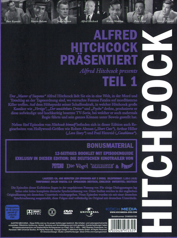 Enthält: Deutsche Trailer zu "Psycho", "Die Vögel", "Marnie" und "Frenzy" (ca. 30 Minuten); Booklet mit Episodenguide; einige Folgen nur im engl. Originalton mit dt. Untertiteln;