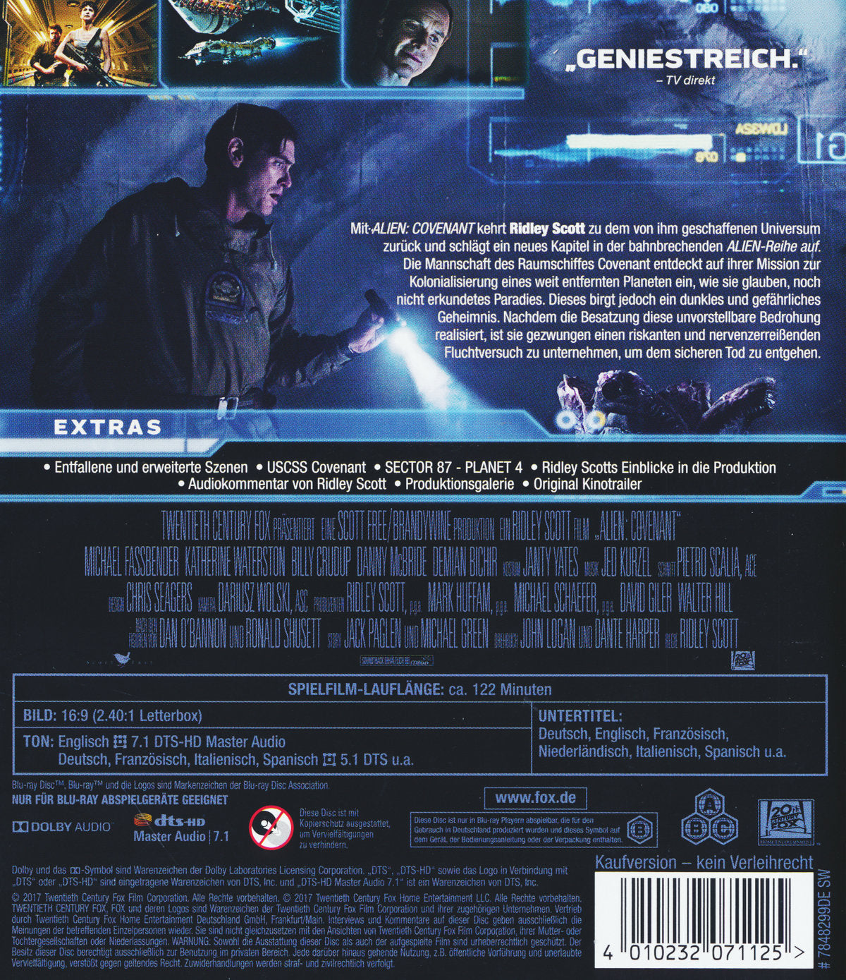 Ridley Scott kehrt mit ALIEN:COVENANT zu dem von ihm erschaffenen Universum zurück, einem neuen Kapitel in seiner bahnbrechenden ALIEN Franchise. Die Crew des Kolonisationsraumschiffs Covenant ist auf der Reise zu einem abgelegenen Planeten am Rand der Galaxie. Sie entdeckt - wie sie glaubt - ein unerforschtes Paradies, aber tatsächlich ist es eine dunkle, gefährliche Welt. Als die Crew mit einer ihre Vorstellungskraft übersteigenden Bedrohung konfrontiert wird, muss sie einen grauenvollen Fluchtversuch unternehmen.