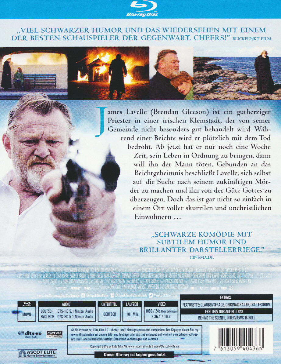 Eigentlich will Dorfpriester James Lavelle doch nur, dass es allen Menschen in seinem Provinznest an der irischen Küste gut geht. Doch seine Gemeinde schockt ihn regelmäßig durch ihren Hass und ihre Streitlust. Eines Tages, als der Geistliche die Beichte abnimmt, droht ihm eines seiner Schäfchen: „Am Sonntag bist du tot!“ Nicht, dass der unbescholtene Priester etwas ausgefressen hätte. Er soll stellvertretend für einen anderen katholischen Priester sterben, der dem Gläubigen früher Schlimmes angetan hat, aber nicht mehr lebt. Immerhin hat sich vor knapp 2000 Jahren ja auch Jesus Christus für die Sünden der Menschheit geopfert und schuldlos auf dem Hügel Golgatha kreuzigen lassen. Das Beichtgeheimnis hindert den Priester daran, die Polizei einzuschalten. Also muss er sich selbst auf die Suche nach seinem zukünftigen Mörder machen. Eine turbulente Woche vergeht wie im Flug. Wird die raue Küste Irlands am Sonntag zu seinem ganz persönlichen Golgatha?
