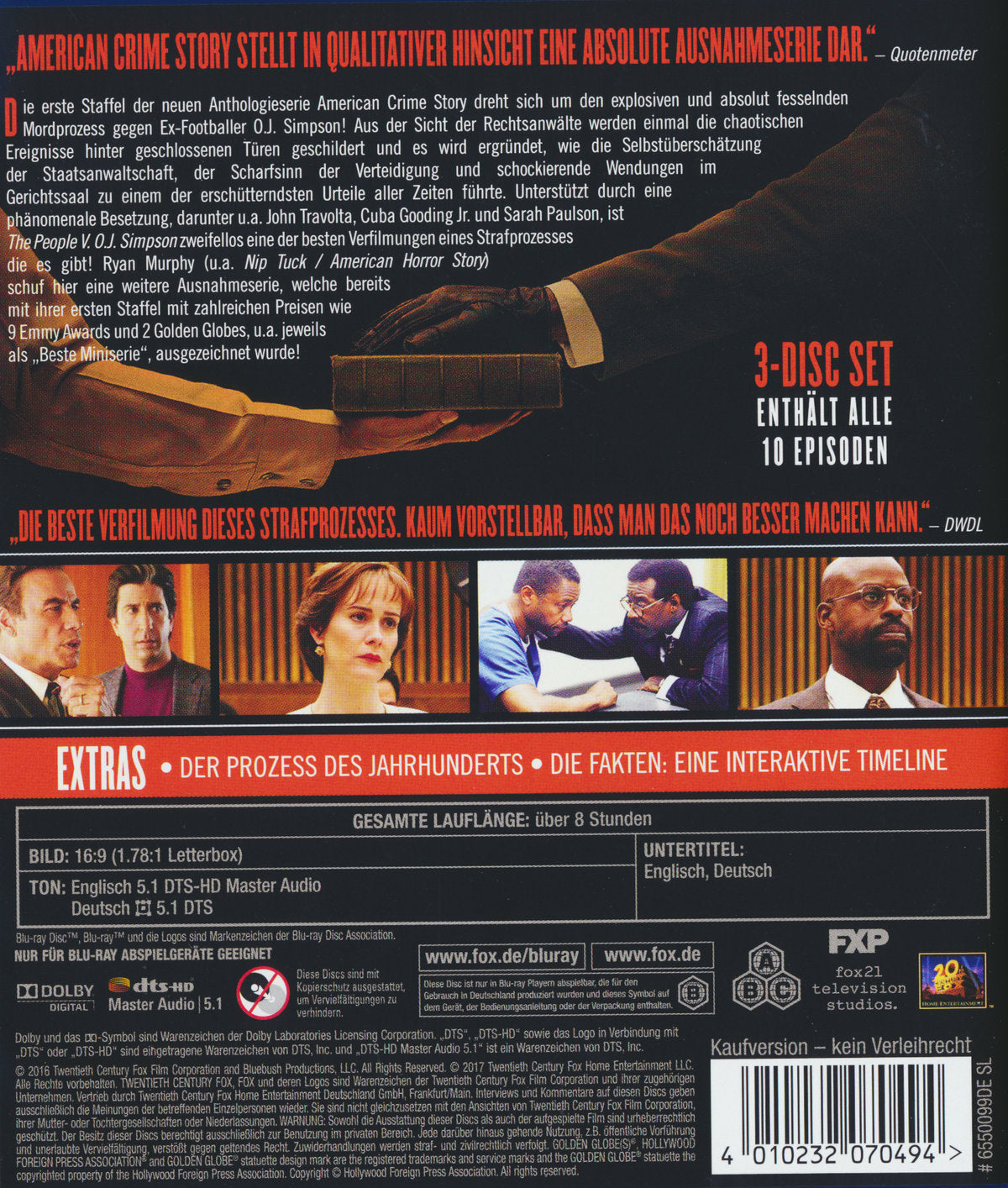 Eine phänomenale Besetzung, darunter John Travolta, Cuba Gooding Jr., Sarah Paulson, David Schwimmer, Bruce Greenwood und Sterling K. Brown, spielt die Hauptrollen in dieser hochgelobten Serienstaffel über den explosiven und absolut fesselnden Mordprozess gegen O. J. Simpson. Aus der Sicht der Rechtsanwälte werden die chaotischen Vorkommnisse hinter geschlossenen Türen geschildert, und es wird ergründet, wie die Selbstüberschätzung der Staatsanwaltschaft, der Scharfsinn der Verteidigung und schockierende Wendungen im Gerichtssaal zu einem der erschütterndsten Urteile aller Zeiten führten. Dieses auf dem Buchbestseller "The Run of His Life: The People v. O.J. Simpson" von Jeffrey Toobin basierende TV-Highlight zeigt Ihnen den Gerichtsprozess, der die Welt gefesselt hat, aus einem völlig neuen Blickwinkel.