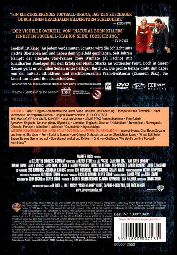 Enthält: Trailer; Original-Kommentare von Oliver Stone und Stab und Besetzung; Tonspur nur mit Filmmusik; Nicht verwendete und verpatzte Szenen; Original-Dokumentation "Full Contact: The Making of Any Given Sunday"; 3 Musik-Videos; Jamie Foxx Probeaufnahmen; Foto-Galerie; DVD-Rom Part;