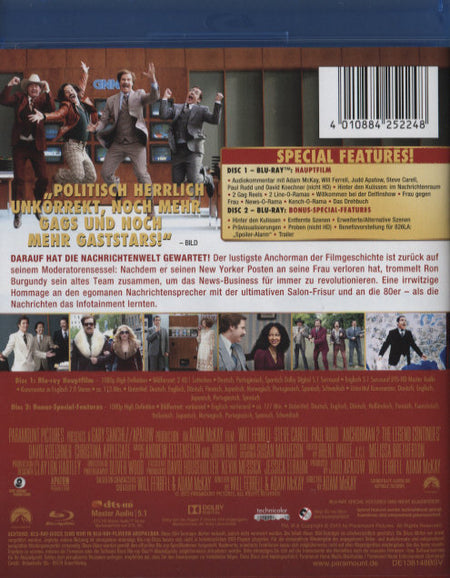 Enthält: Audiokommentar mit Adam McKay, Will Ferrell, Judd Apatow, Steve Carell, Paul Rudd und David Koechner; Hinter den Kulissen: im Nachrichtenraum; 2 Gag Reels; 2 Line-O-Ramas; Willkommen bei der Delfinshow ; Frau gegen Frau; News-O-Rama; Kench-O-Rama; Das Drehbuch; Entfernte Szenen; Erweiterte Szenen; Alternative Szenen; Prävisualisierungen; Proben; Benefizvorstellung für 826LA: "Spoiler-Alarm"; Trailer;