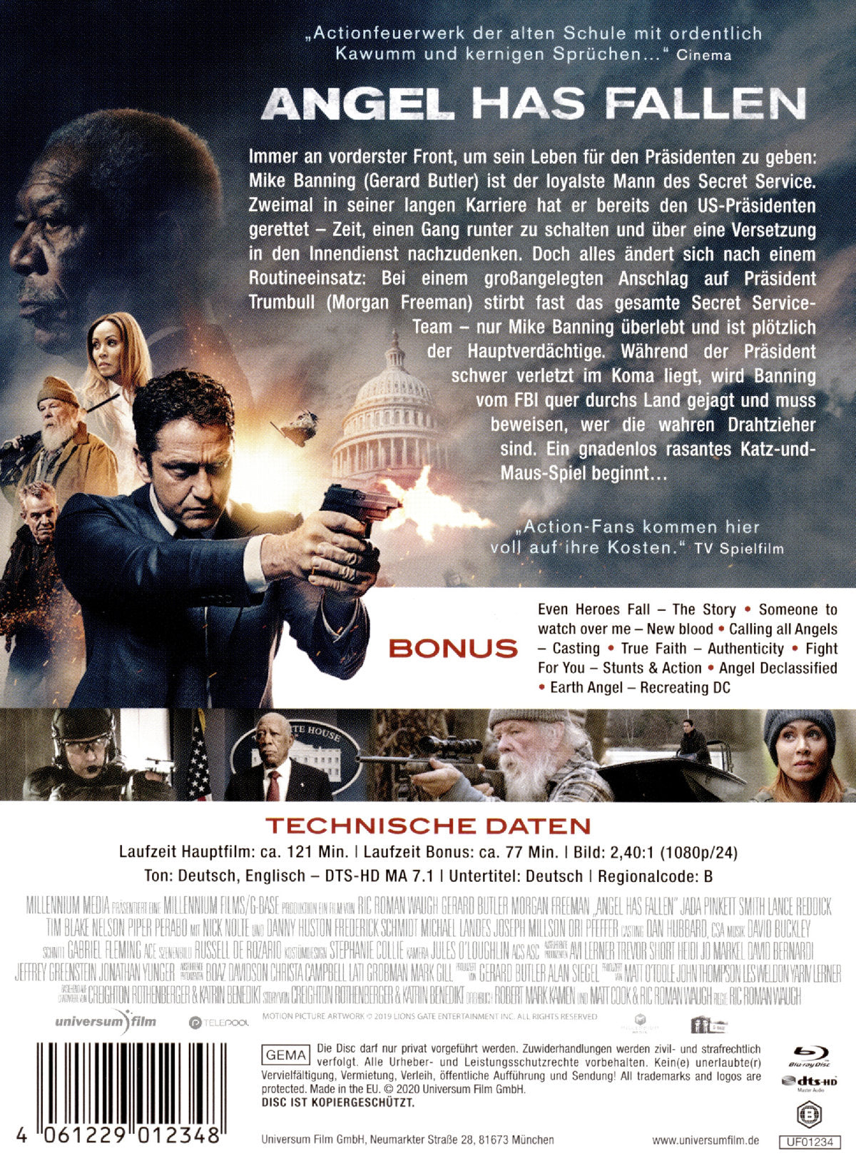 Immer an vorderster Front, um sein Leben für den Präsidenten zu geben: Mike Banning (Gerard Butler) ist der loyalste Mann des Secret Service. Zweimal in seiner langen Karriere hat er bereits den US-Präsidenten gerettet – Zeit, einen Gang runter zu schalten und über eine Versetzung in den Innendienst nachzudenken. Doch alles ändert sich nach einem vermeintlichen Routineeinsatz: Bei einem großangelegten Anschlag auf Präsident Trumbull (Morgan Freeman) stirbt fast das gesamte Secret Service-Team – nur Mike Banning überlebt und ist plötzlich der Hauptverdächtige. Während der Präsident schwer verletzt im Koma liegt, wird Banning von seinen Kollegen und dem FBI quer durchs Land gejagt und muss beweisen, wer die wahren Drahtzieher sind. Ein gnadenlos rasantes Katz-und-Maus-Spiel beginnt…