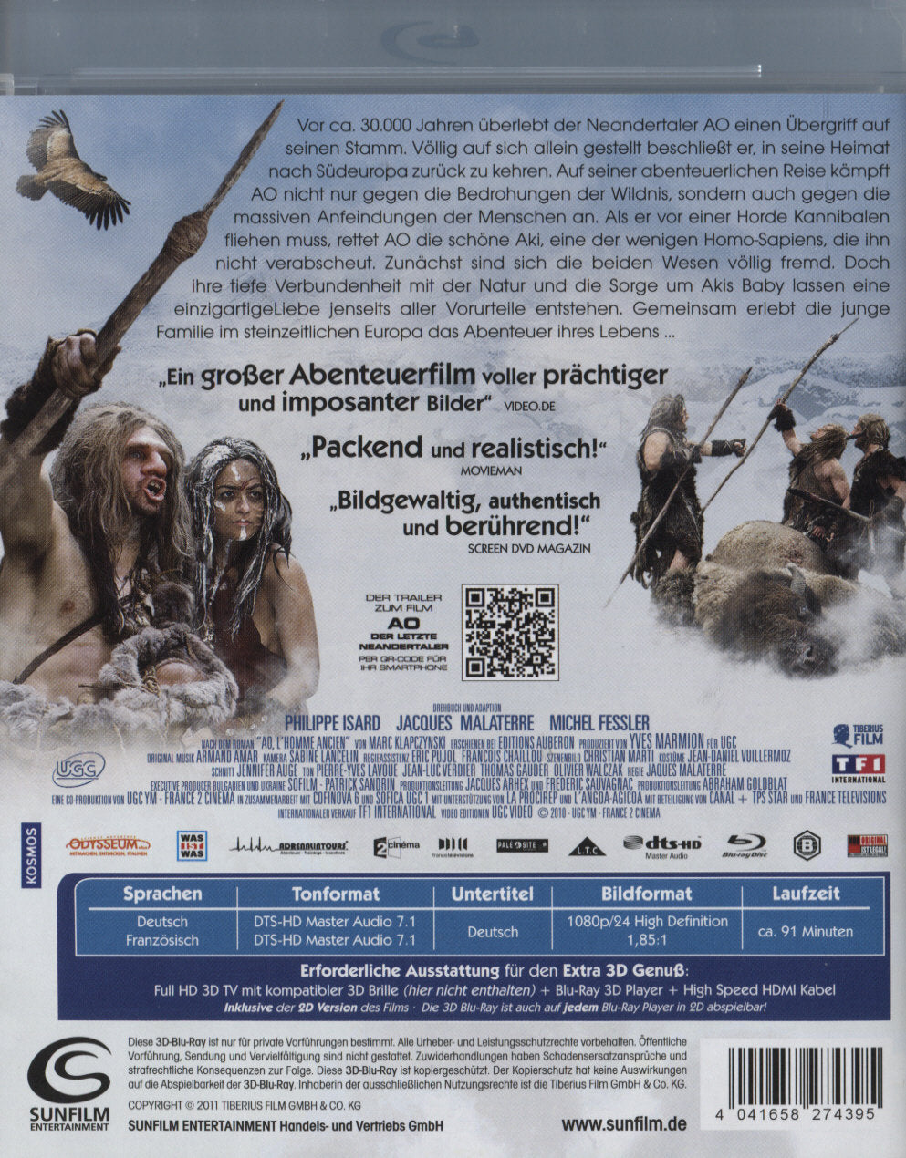 Vor ca. 30.000 Jahren überlebt der Neandertaler AO, einen Übergriff auf seinen Stamm. Völlig auf sich allein gestellt, beschließt er, in seine Heimat nach Südeuropa zurückzukehren. Auf seiner abenteuerlichen Reise kämpft AO nicht nur gegen die Bedrohungen der Wildnis, sondern auch gegen die massiven Anfeindungen der Menschen an. Als er vor einer Horde Kannibalen fliehen muss, rettet AO die schönen Aki, eine der wenigen Homo-Sapiens, die ihn nicht verabscheut. Zunächst sind sich die beiden Wesen völlig fremd. Doch ihre tiefe Verbundenheit mit der Natur und die Sorge um Akis Baby lassen eine einzigartige Liebe jenseits aller Vorurteile entstehen. Gemeinsam erlebt die junge Familie im steinzeitlichen Europa das Abenteuer ihres Lebens ...