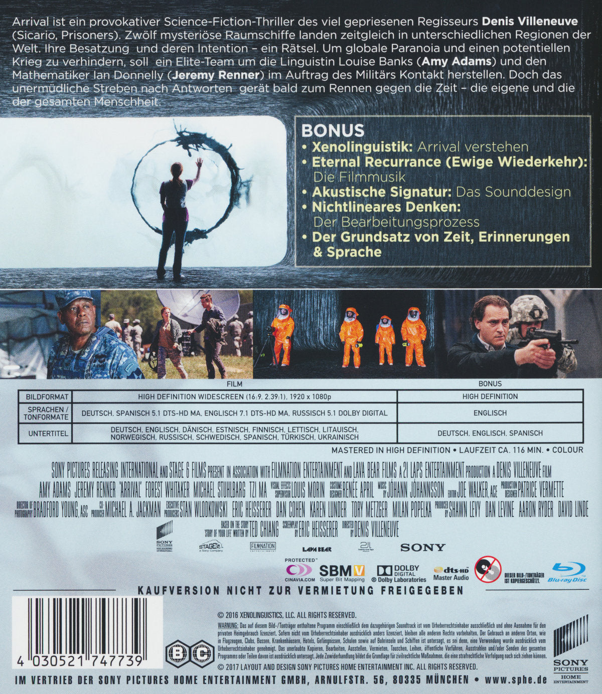 Enthält: Xenolinguistik: Arrival verstehen; Eternal Recurrance (Ewige Wiederkehr): Die Filmmusik; Akustische Signatur: Das Sounddesign; Nichtlineares Denken: Der Bearbeitungsprozess; Der Grundsatz von Zeit, Erinnerungen & Sprache;