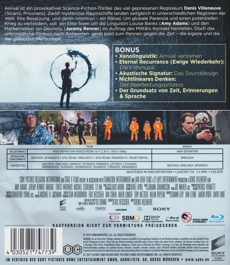 Zwölf mysteriöse Raumschiffe landen zeitgleich in unterschiedlichen Regionen der Welt. Ihre Besatzung und deren Intention - ein Rätsel. Um globale Paranoia und einen potentiellen Krieg zu verhindern, soll ein Elite-Team um die Linguistin Louise Banks (Amy Adams) und den Mathematiker Ian Donnelly (Jeremy Renner) im Auftrag des Militärs Kontakt herstellen. Doch das unermüdliche Streben nach Antworten gerät bald zum Rennen gegen die Zeit - die eigene und die der gesamten Menschheit.