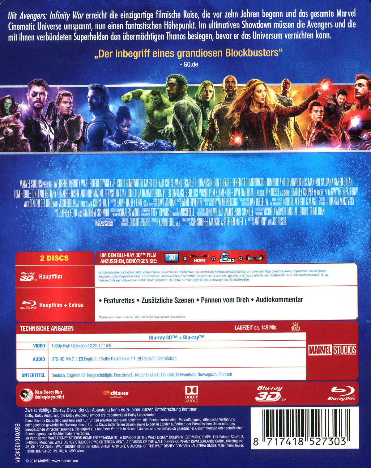 Mit Avengers: Infinity War erreicht die einzigartige filmische Reise, die vor zehn Jahren begann und das gesamte Marvel Cinematic Universe umspannt, nun einen fantastischen Höhepunkt. Im ultimativen Showdown müssen die Avengers und die mit ihnen verbündeten Superhelden den übermächtigen Thanos besiegen, bevor er das Universum vernichten kann.