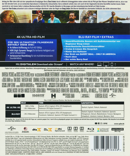 Enthält: Enthält 2 Discs: 4K UHD und Blu-ray Disc: Bonus auf der Blu-Ray: Unveröffentlichte Szenen mit Audiokommentar von Regisseur Doug Liman; Amerikanische Geschichtenerzähler; Cruise & Liman: Ein Gespräch; Hinter den Kulissen; Der Dreh von "Barry Seal - Only in America"; Hoch oben; Der echte Barry Seal;