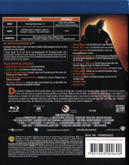 Enthält: Video-Kommentar des Regisseurs und des Drehbuchautors; IMAX-Prolog zu "The Dark Knight"; "Tankman Begins": Eine Parodie auf "Batman Begins"; Konzept, Design und Entwicklung des Film und der Besetzung; Training von Geist und Körper: Werden Sie Zeuge von Christian Bales Verwandlung in Batman; Die Entstehung von Gotham City; Umhang und Maske: Die Entwicklung des neuen Outfits; Batman - Der Tumbler: Die Weiterentwicklung des Batmobils; Weg der Erkenntnis: Die Filmarbeiten auf Island; Rettung von Gotham City: Miniaturen, CGI und Effekte für die Jagdszene in der Schwebebahn; Die Entwicklung der Fledermaus; Gedanken zum Drehbuch; Der digitale Batman: Die Effekte, die Sie eventuell vermisst haben; Batman Begins Stunts; Nicht gezeigte Sequenzen; Bildergalerie; USA-Kinotrailer;