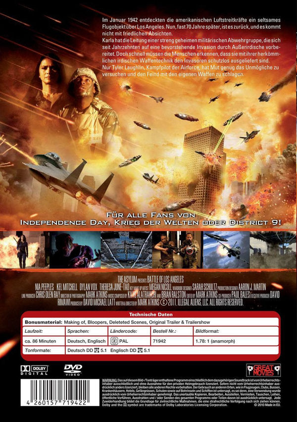Im Januar 1942 entdeckten die amerikanischen Luftstreitkräfte ein seltsames Flugobjekt über Los Angeles. Nun fast 70 Jahre später ist es zurück, und es kommt nicht mit friedlichen Absichten… Karla hat die Leitung einer streng geheimen militärischen Abwehrgruppe, die sich seit Jahrzehnten auf eine bevorstehende Invasion durch Außerirdische vorbereitet. Doch schnell müssen die Menschen erkennen, dass sie mit ihrer herkömmlichen irdischen Waffentechnik den Invasoren schutzlos ausgeliefert sind. Nur Tyler Laughlin, Kampfpilot der Airforce, hat Mut genug das Unmögliche zu versuchen und den Feind mit den eigenen Waffen zu schlagen...