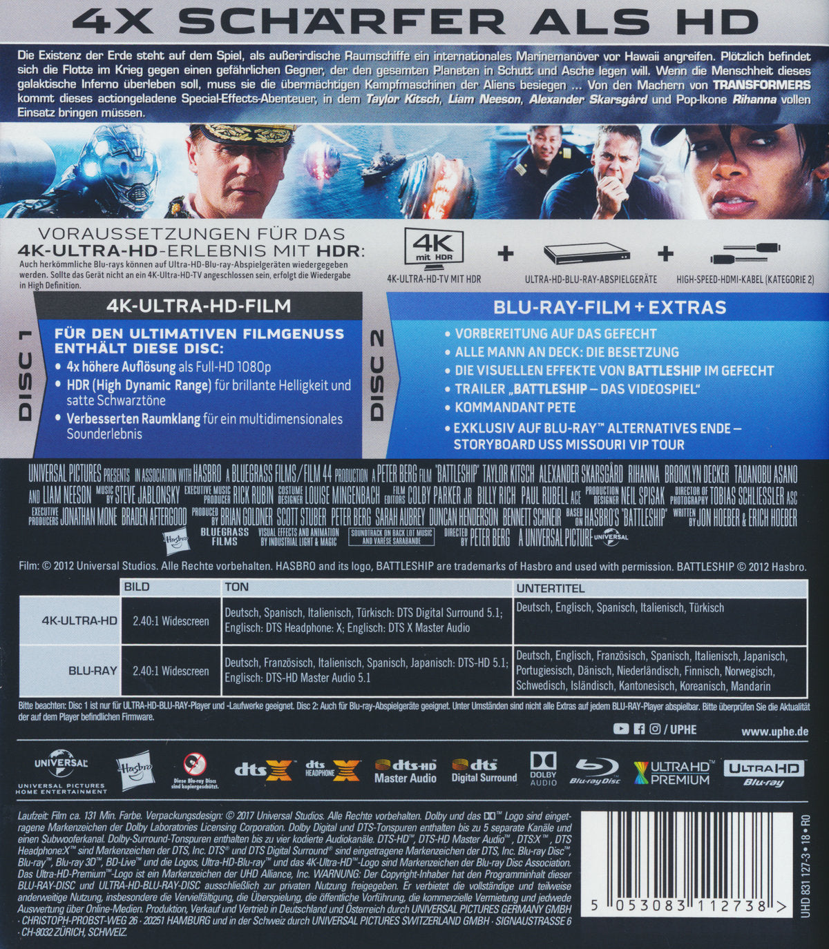 Enthält: Enthält 2 Discs: 4K UHD und Blu-ray Disc; Vorbereitung auf das Gefecht; Alle Mann an Deck: Die Besetzung; Visuelle Effekte; Trailer "Battleship - Das Videospiel"; Kommandant Pete; Alternatives Ende;