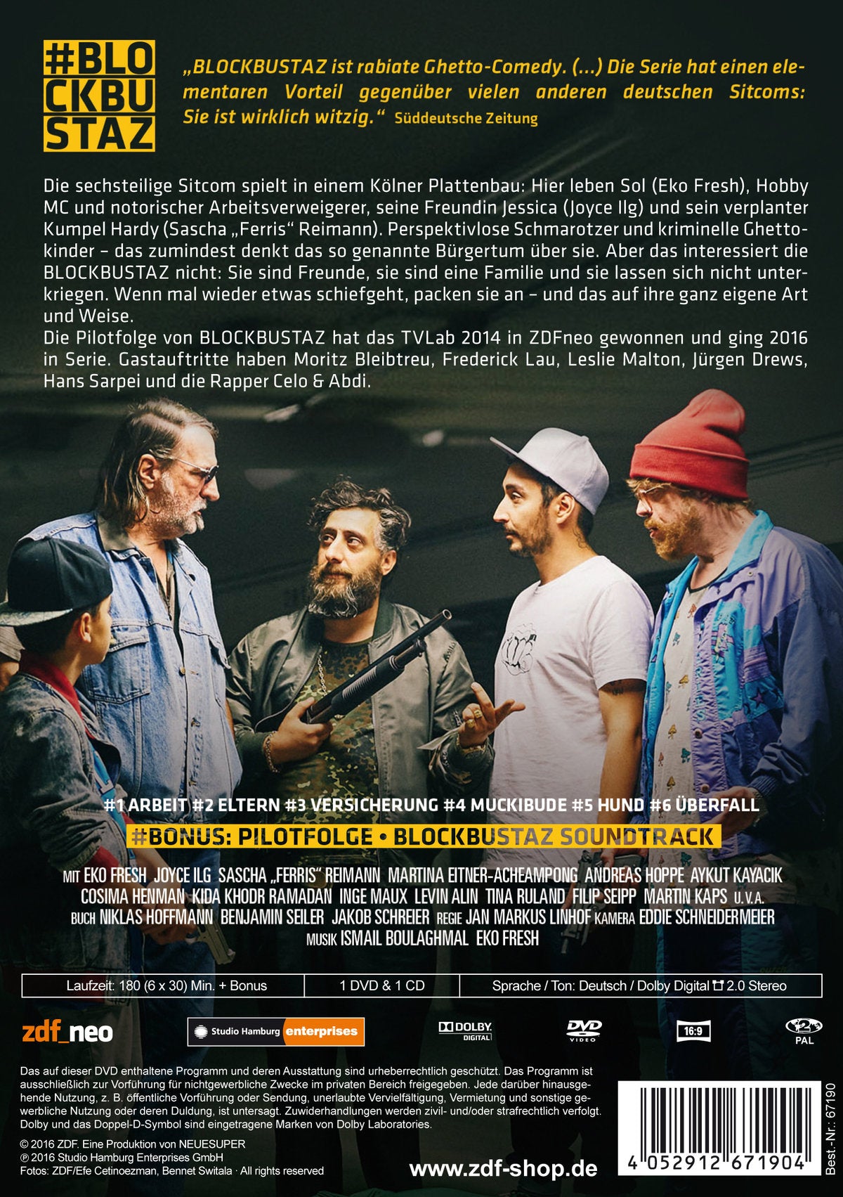 "Die sechsteilige Sitcom spielt in einem Kölner Plattenbau: Hier leben Sol (Eko Fresh), HobbyMC und notorischer Arbeitsverweigerer, seine Freundin Jessica (Joyce Ilg) und sein verplanterKumpel Hardy (Sascha „Ferris“ Reimann). Perspektivlose Schmarotzer und kriminelle Ghettokinder– das zumindest denkt das so genannte Bürgertum über sie. Aber das interessiert die„BLOCKBUSTAZ“ nicht: Sie sind Freunde, sie sind eine Familie und sie lassen sich nicht unterkriegen.Wenn mal wieder etwas schiefgeht, packen sie an – und das auf ihre ganz eigene Artund Weise.Die Pilotfolge von „BLOCKBUSTAZ“ hat das TVLab 2014 in ZDFneo gewonnen und ging 2016in Serie. Gastauftritte haben Moritz Bleibtreu, Frederick Lau, Leslie Malton, Jürgen Drews,Hans Sarpei und die Rapper Celo & Abdi."