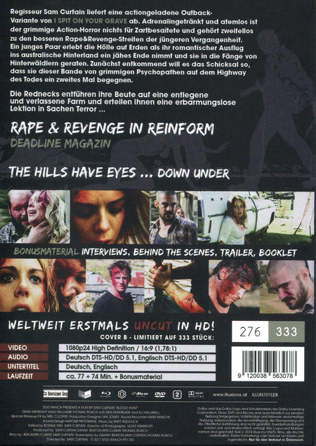 Enthält: Auf 333Stück limitiertes Mediabook - Weltweit erstmals uncut in HD! - Mehrseitiges Booklet - Behind the Scenes - Interviews - Trailer - DVD-Version Zusatzinfo: Regisseur Sam Curtain liefert mit BLOOD HUNT - BLUTRACHE eine actiongeladene Outback-Variante von I SPIT ON YOUR GRAVE ab. Adrenalingetränkt und atemlos ist der grimmige Action-Horror nichts für Zartbesaitete und gehört zweifellos zu den besseren Rape&Revenge-Streifen der jüngeren Vergangenheit. DVD: DD 5.1: Deutsch, Englisch DVD: 1,78:1 (16:9)