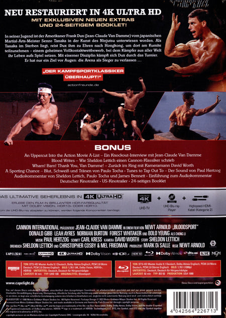 Enthält: 2-Disc Limited Collector' s Edition im Mediabook mit dem Film weltweit erstmals in 4K Ultra HD mit Dolby Vision, HDR10+ und HDR10 auf UHD-Blu-ray und in High Definition auf Blu-ray. Mit exklusiven neuen Extras und 24-seitigem Booklet mit neuem Text zum Film. Bonus: An Uppercut Into the Action Movie A-List – Ein Knockout mit Jean-Claude Van Damme; Blood Writes – Wie Sheldon Lettich einen Cannon-Klassiker schrieb; Wham! Bam! Thank You, Van Damme! – Zurück im Ring mit Kameramann David Worth; A Sporting Chance – Blut, Schweiß und Tränen von Paulo Tocha; Tunes to Tap Out to – Der Sound von Paul Hertzog; Audiokommentar von Sheldon Lettich, Paulo Tocha und James Bennett; Einführung zum Audiokommentar; Deutscher Kinotrailer; US-Kinotrailer; 24-seitiges Booklet