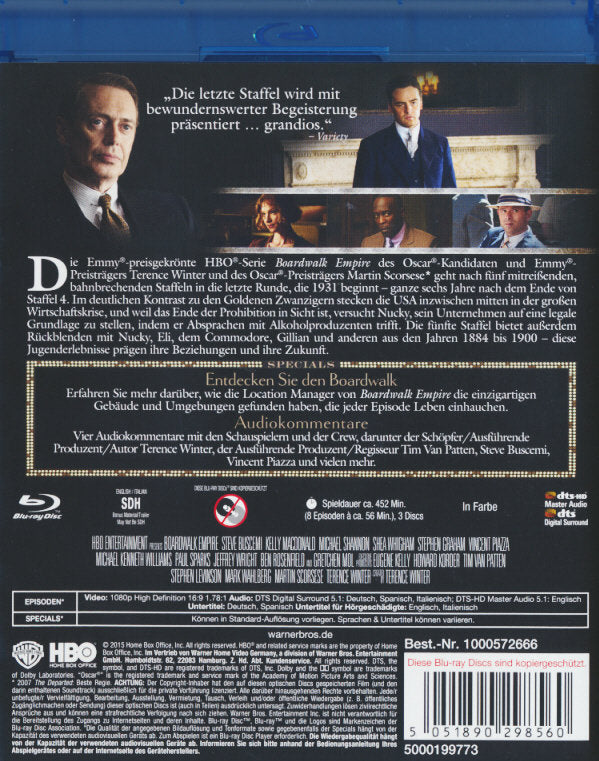 Die Emmy-preisgekrönte HBO-Serie Boardwalk Empire des Oscar-Kandidaten/Emmy-Preisträgers Terence Winter und des Oscar-Preisträgers Martin Scorsese geht nach fünf mitreißenden, bahnbrechende Staffeln in die letzte Runde, die 1931 beginnt ? ganze sechs Jahre nach dem Ende von Staffel 4. Im deutlichen Kontrast zu den Goldenen 20er-Jahren stecken die USA inzwischen mitten in der großen Wirtschaftskrise, und weil das Ende der Prohibition in Sicht ist, versucht Nucky sein Unternehmen auf eine legale Grundlage zu stellen, indem er Absprachen mit Alkoholproduzenten trifft. Die fünfte Staffel bietet außerdem Rückblenden mit Nucky, Eli, dem Commodore, Gillian und anderen aus den Jahren 1884-1900 - diese Jugenderlebnisse prägen ihre Beziehungen und ihre Zukunft.