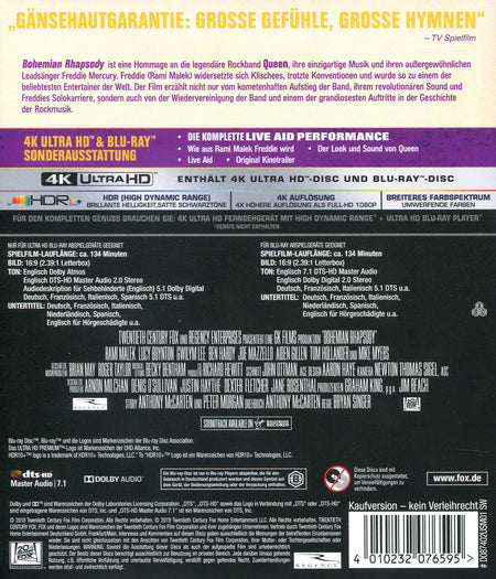 BOHEMIAN RHAPSODY ist eine fulminante Feier von Queen, ihrer Musik und ihrem außergewöhnlichen Leadsänger Freddie Mercury, der Klischees trotzte und mit Konventionen brach, um einer der beliebtesten Entertainer weltweit zu werden. Der Film verfolgt den meteorhaften Aufstieg der Band durch ihre kultigen Songs und ihren revolutionären Sound, ihren Fast-Untergang, als Mercurys Lebensstil außer Kontrolle gerät, und ihre triumphale Wiedervereinigung am Vorabend von "Live Aid", einem Konzert, bei dem Mercury, konfrontiert mit einer lebensbedrohenden Krankheit, die Band bei einem der herausragendsten Konzerte in der Geschichte der Rockmusik anführt. Er zementierte damit das Vermächtnis einer Band, die immer mehr wie eine Familie war, und die bis heute noch Außenstehende, Träumer und Musikliebhaber inspiriert.