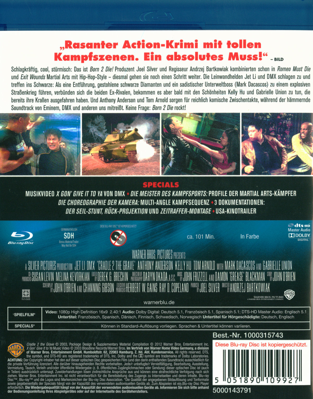High Speed und Non-stop Action, sowie coole, innovative Kampfszenen. Dafür garantieren MATRIX Produzent Joel Silver und Andrzej Bartkowiak, Regisseur von "Romeo must Die" und "Exit Wounds". Auf spektakuläre Weise inszenieren sie in "Born 2 Die" die Story um den Meisterdieb Tony Fait (Star-Rapper DMX), der eine ungewöhnliche Allianz mit dem Special Agent Su (Martial Arts Master Jet Li) eingeht, um seine gekidnappte Tochter im Austausch gegen unschätzbar wertvolle Diamanten zu retten. Ein Meisterwerk des Action-Genres.