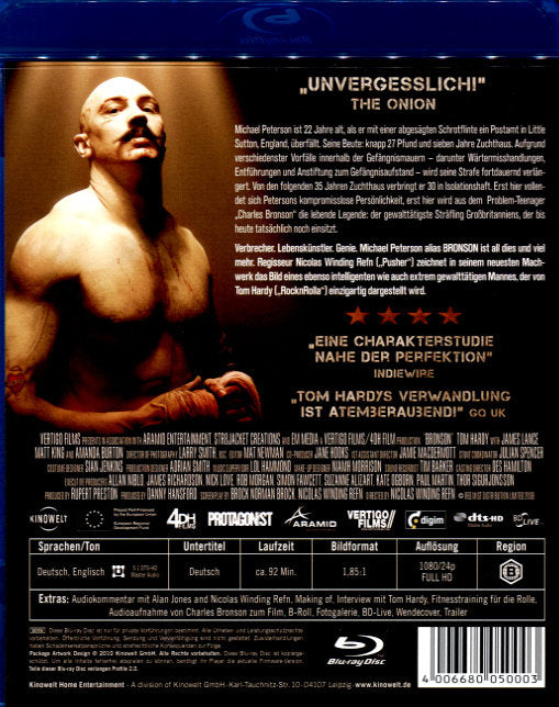 Enthält: Audioaufnahme von Charles Bronson zum Film; Audiokommentar mit Filmkritiker Alan Jones und Regisseur Nicolas Winding Refn; B-Roll; Fitnesstraining für die Rolle als Charles Bronson; Fotogalerie; Interview mit Tom Hardy; Making Of; Trailer; BD-Live;