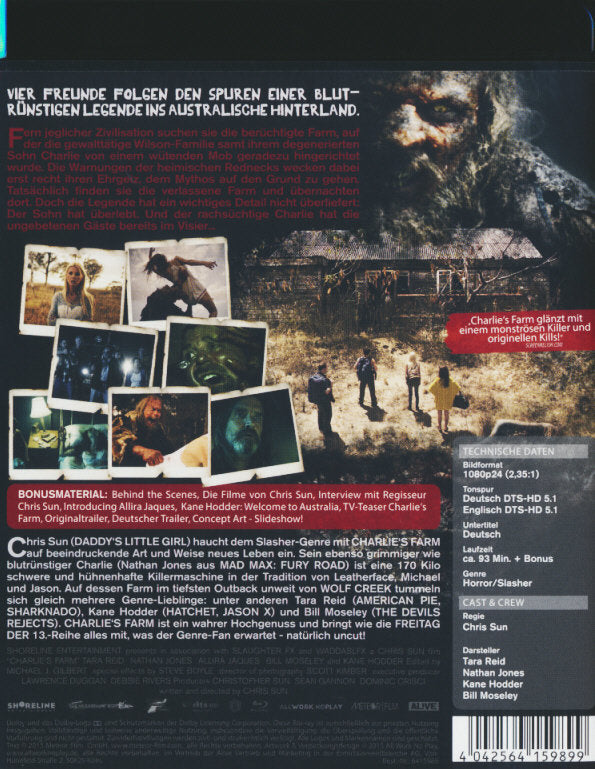 Enthält: Behind the Scenes; Die Filme von Chris Sun; Interview mit Regisseur Chris Sun; Introducing Allira Jacques; Kane Hodder: Welcome to Austria; TV-Teaser Charlie's Farm; Originaltrailer; Deutscher Trailer; Concept Art - Slideshow!;