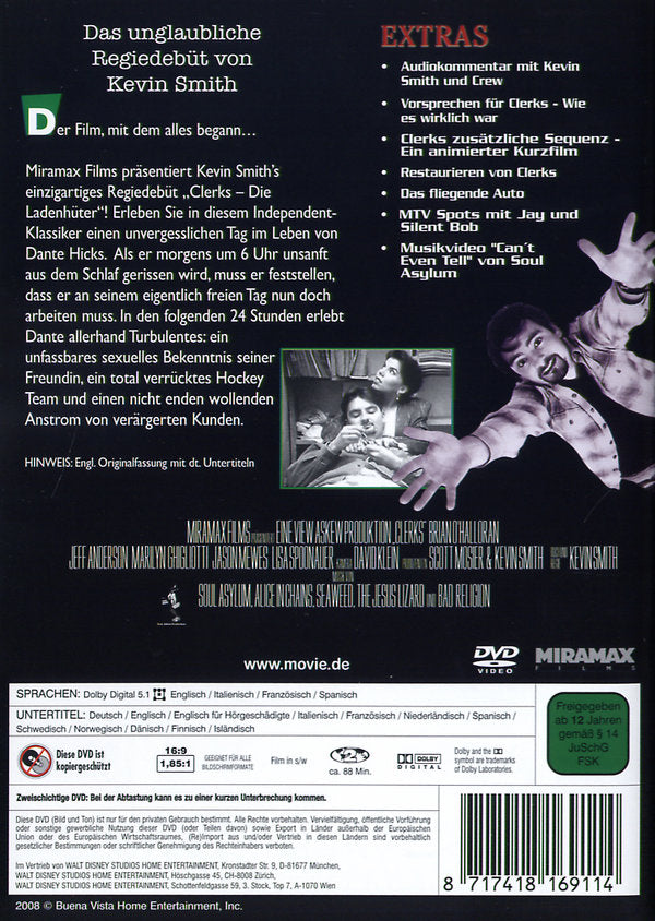 Enthält: Audiokommentar mit Kevin Smith und Crew; Vorsprechen für Clerks - Wie es wirklich war; Clerks zusätzliche Sequenz - Ein animierter Kurzfilm; Restaurieren von Clerks; Das fliegende Auto; MTV Spots mit Jay und Silent Bob; Musikvideo "Can't Even Tell" von Soul Asylum;