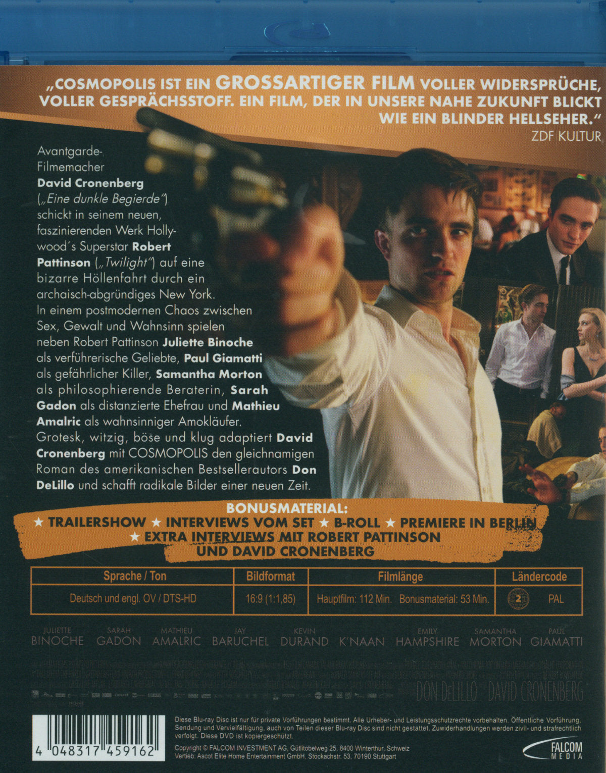 Enthält: Interviews vom Set; B-Roll; Premiere Berlin; Extra Interviews mit Robert Pattinson und David Cronenberg; Trailershow; Laufzeit Bonusmaterial ca. 53 Min.;