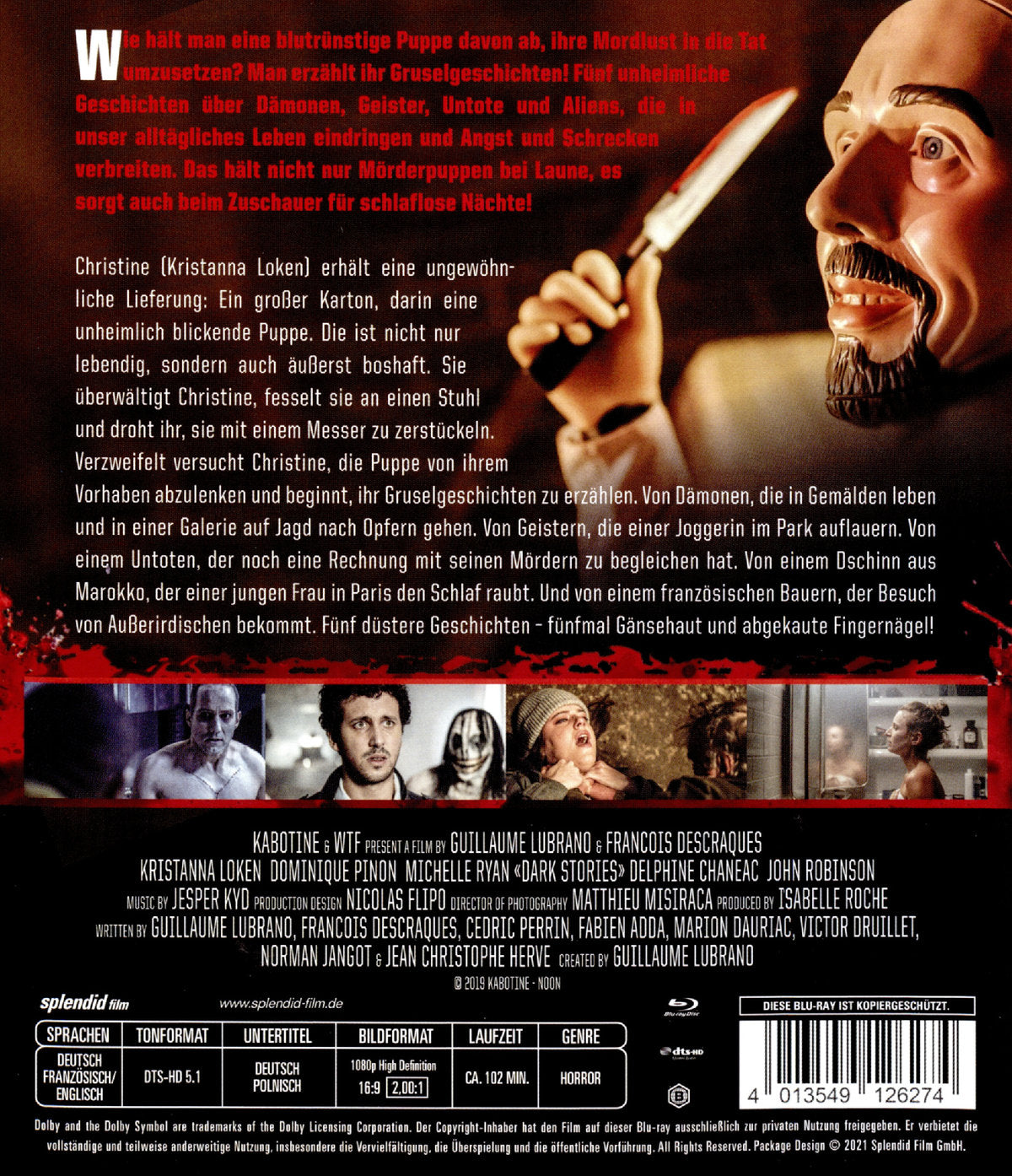 Christine (Kristanna Loken) erhält eine ungewöhnliche Lieferung: Ein großer Karton, darin eine unheimlich blickende Puppe. Die ist nicht nur lebendig, sondern auch äußerst boshaft. Sie überwältigt Christine, fesselt sie an einen Stuhl und droht ihr, sie mit einem Messer zu zerstückeln. Verzweifelt versucht Christine, die Puppe von ihrem Vorhaben abzulenken und beginnt, ihr Gruselgeschichten zu erzählen. Von Dämonen, die in Gemälden leben und in einer Galerie auf Jagd nach Opfern gehen. Von Geistern, die einer Joggerin im Park auflauern. Von einem Untoten, der noch eine Rechnung mit seinen Mördern zu begleichen hat. Von einem Dschinn aus Marokko, der einer jungen Frau in Paris den Schlaf raubt. Und von einem französischen Bauern, der Besuch von Außerirdischen bekommt. Fünf düstere Geschichten – fünfmal Gänsehaut und abgekaute Fingernägel!