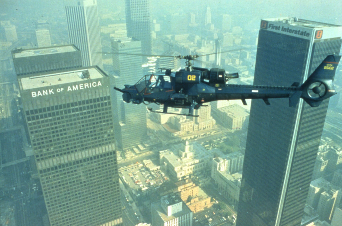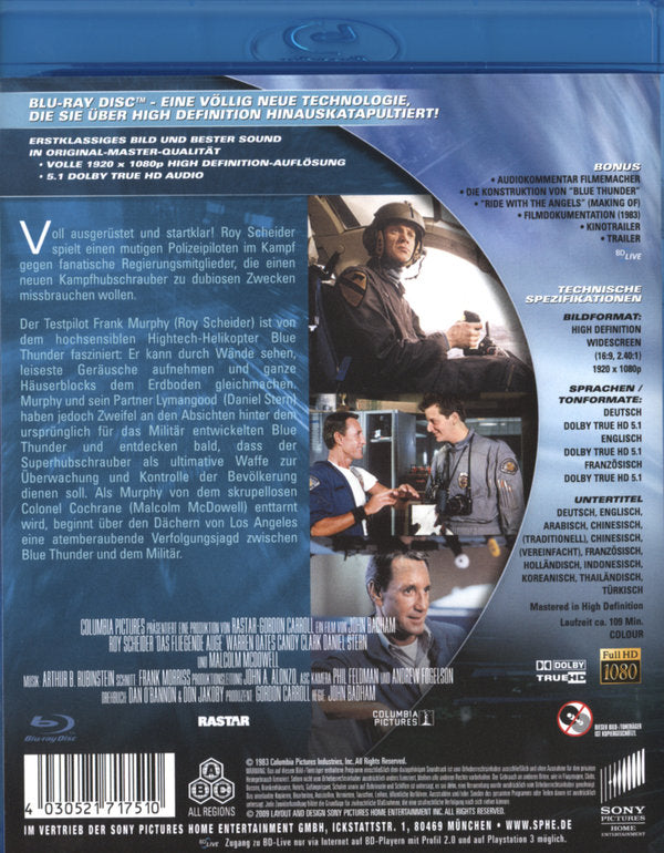 Über dem Smog-verseuchten Los Angeles kreist Frank Murphy (Roy Scheider) mit seinem Hubschrauber "Blue Thunder", um von der Luft aus für "Ordnung" in der Stadt zu sorgen. Die Maschine ist mit allermodernster Überwachungstechnik und sechs 20mm Bordkanonen ausgerüstet.