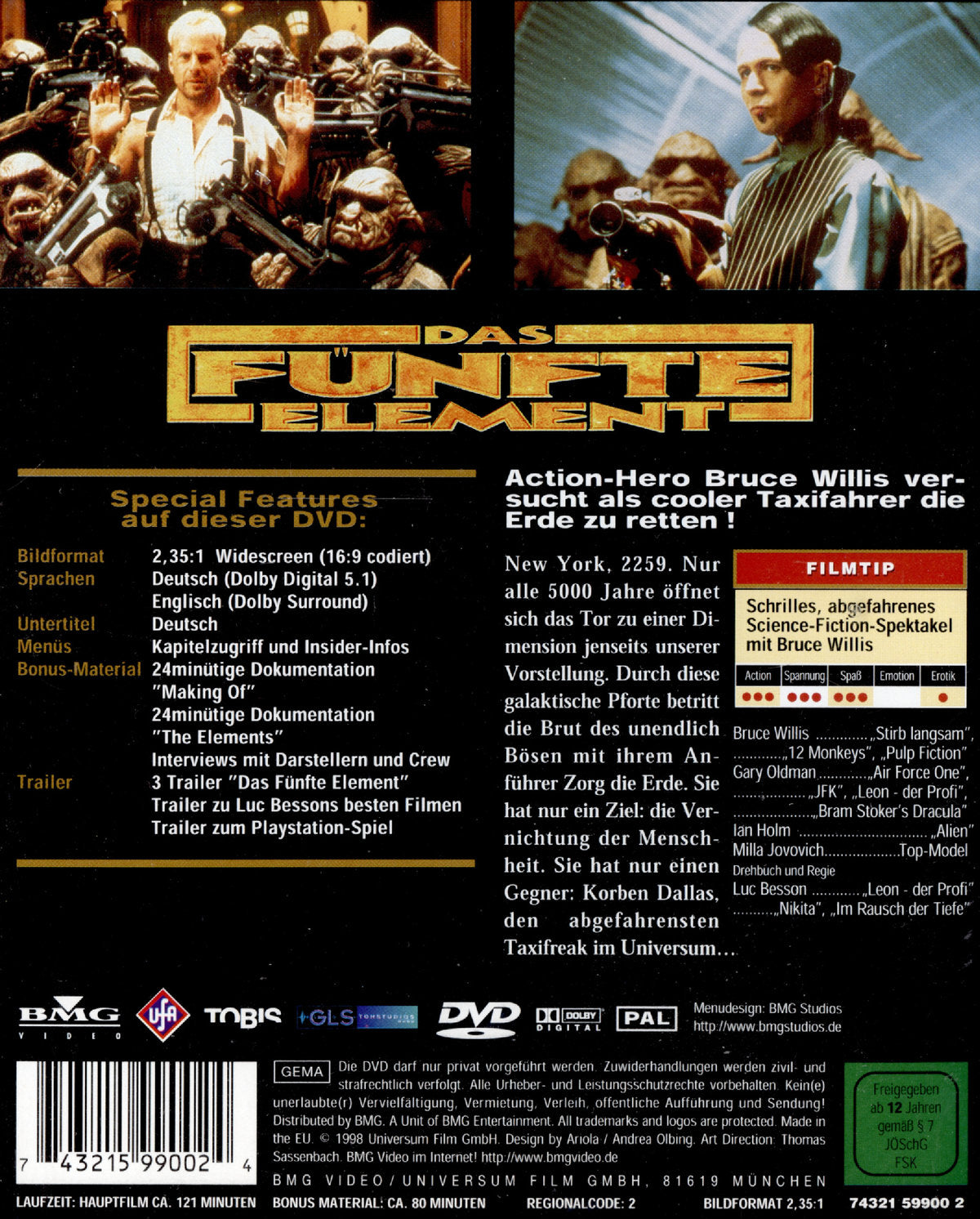 Enthält: 24 minütiges "Making of " 24 minütige Dokumentation zu "The Element" Interviews mit : B.Willis, G. Goldman,M. Jovovich, C. Tucker, L. Besson, E. Serra 3 Trailer zum " Fünften Element" Ausschnitte aus dem Playstation-Spiel
