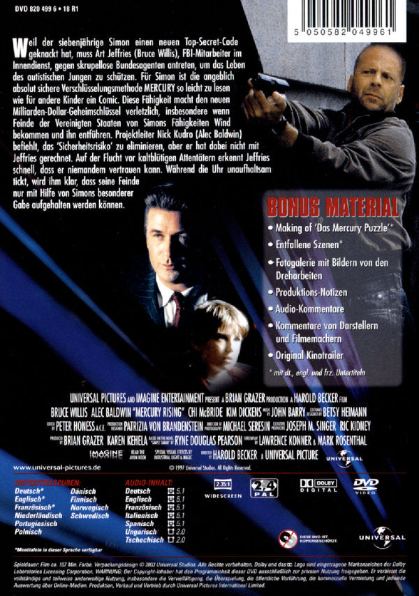 Weil der siebenjährige Simon einen neuen Top-Secret-Code geknackt hat, muss Art Jeffries, FBI-Mitarbeiter im Innendienst, gegen skrupellose Bundesagenten antreten, um das Leben des autistischen Jungen zu schützen. Für Simon ist die angeblich absolut sichere Verschlüsselungsmethode MERCURY so leicht zu lesen wie für andere Kinder ein Comic. Diese Fähigkeit macht den neuen Milliarden-Dollar-Geheimschlüssel verletzlich, insbesondere wenn Feinde der Vereinigten Staaten von Simons Fähigkeiten Wind bekommen und ihn entführen. Projektleiter Nick Kudro befiehlt, das Sicherheitsrisiko zu eliminieren, aber er hat dabei nicht mit Jeffries gerechnet. Auf der Flucht vor kaltblütigen Attentätern erkennt Jeffries schnell, dass er niemandem vertrauen kann. Während die Uhr unaufhaltsam tickt, wird ihm klar, dass seine Feinde nur mit Hilfe von Simons besonderer Gabe aufgehalten werden können.
