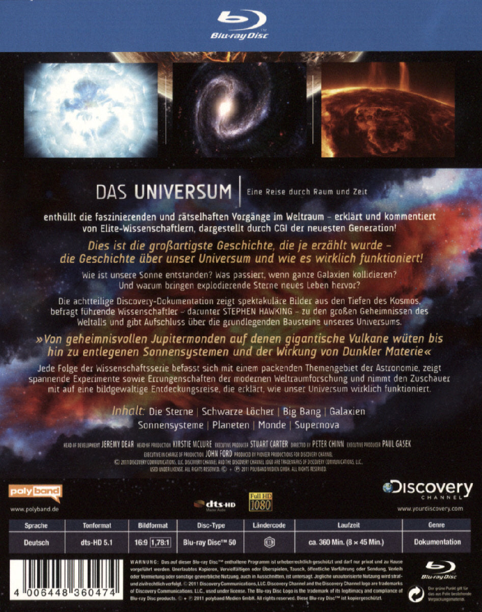 Die achtteilige Discovery-Dokumentation zeigt spektakuläre Bilder aus den Tiefen des Kosmos, befragt führende Wissenschaftler zu den großen Geheimnissen des Weltalls und gibt Aufschluss über die grundlegenden Bausteine unseres Universums.