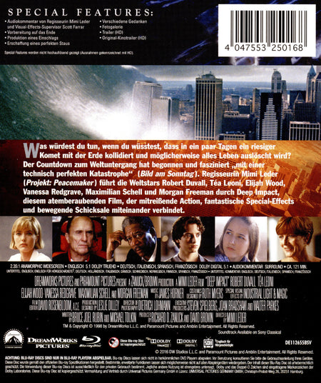 Mimi Leder (Projekt: Peacemaker) inszenierte dieses hochspannende und mitreißende Action-Abenteuer, daß mit einem Top-Staraufgebot - angeführt von Robert Duvall, Tea Leoni, Elijah Wood, Vanessa Redgrave, Maximilian Schell und Morgen Freeman - für Furore sorgt. Die phantastische Mischung aus atemberaubender Spannung und einer gefühlvollen, tief bewegenden Geschichte macht Deep Impact zu einem unvergeßlichen Filmerlebnis.