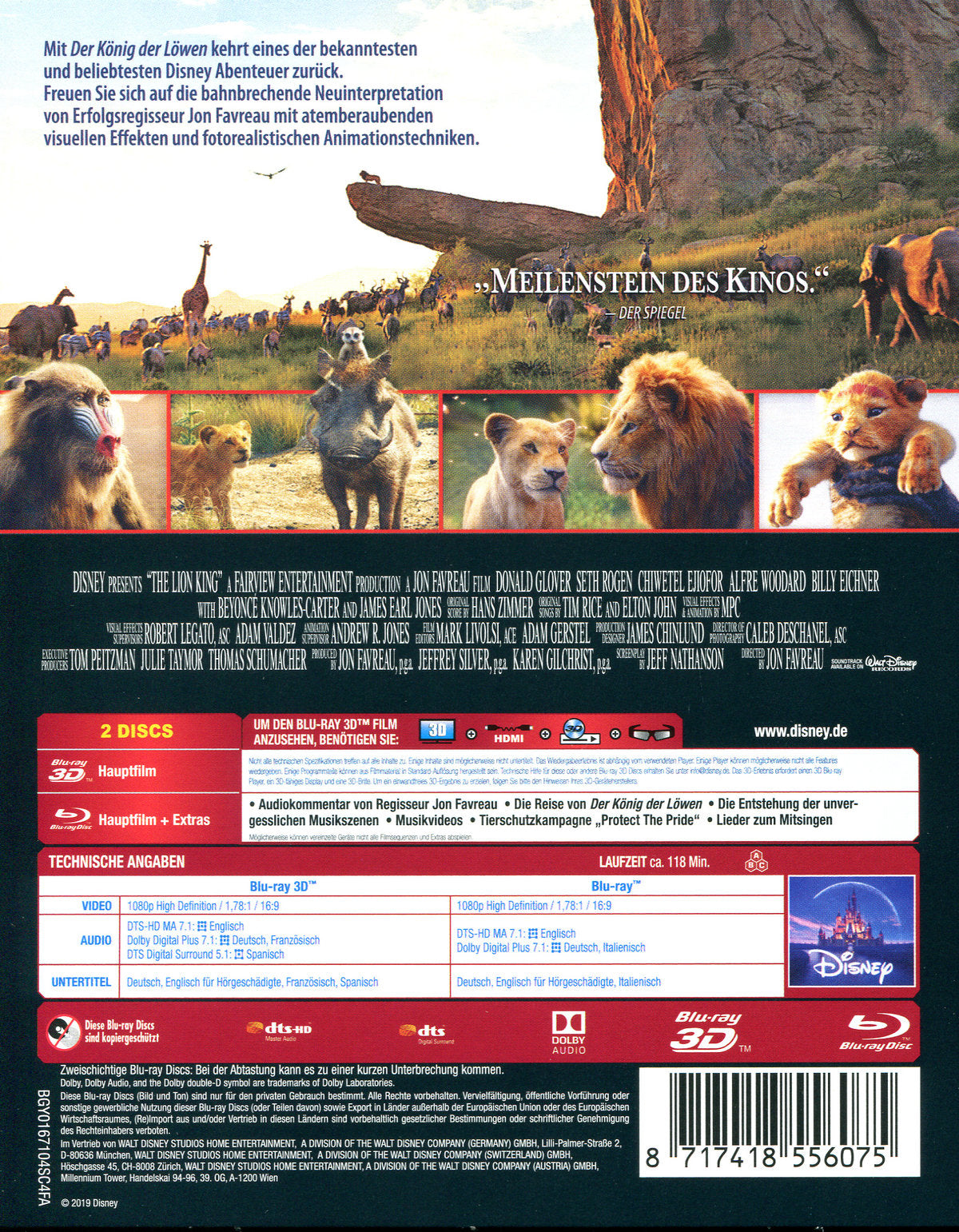 Enthält: Audiokommentar von Regisseur Jon Favreau; Die Reise von Der König der Löwen; Die Entstehung der unvergesslichen Musikszenen; Musikvideos; Tierschutzkampagne "Protect The Pride"; Lieder zum Mitsingen;
