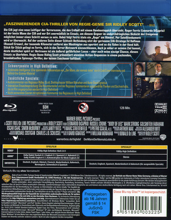 Enthält: Audiokommentar von Regisseur Ridley Scott, Audiodeskription für Blinde in engl. Sprache in DD 2.0; Drehbuchautor William Monahan und Autor David Ignatius; Interaktive Einsatzbesprechung: Die Hauptdarsteller und der Regisseur kommentieren ausgewählte Themen und Sachverhalte, die im Film angesprochen werden (in HD); Nicht verwendete Szenen mit optionalem Kommentar des Regisseurs (in HD); Actionable Intelligence: Eine spannende Videoanalyse von "Der Mann, der niemals lebte" durch Cast/Crew Interviews und Behind-the-Scenes-Material; (in HD); Bonus Digital Copy zum Herunterladen;
