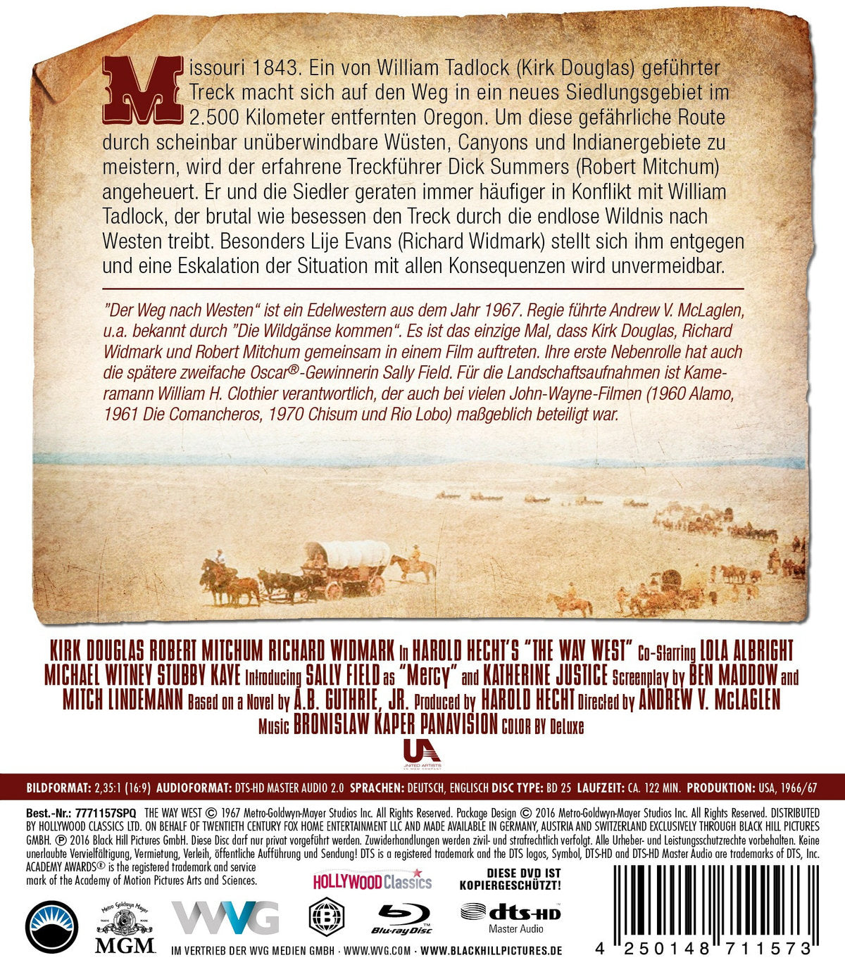 Missouri 1843. Ein von William Tadlock (Kirk Douglas) gef�hrter Treck macht sich auf den Weg in ein neues Siedlungsgebiet im 2.500 Kilometer entfernten Oregon. Um diese gef�hrliche Route durch scheinbar un�berwindbare W�sten, Canyons und Indianergebiete zu meistern, wird der erfahrene Treckf�hrer Dick Summers (Robert Mitchum) angeheuert. Er und die Siedler geraten immer h�ufiger in Konflikt mit William Tadlock, der brutal wie besessen den Treck durch die endlose Wildnis nach Westen treibt. Besonders Lije Evans (Richard Widmark) stellt sich ihm entgegen und eine Eskalation der Situation mit allen Konsequenzen wird unvermeidbar. Bei allen Differenzen der Hauptcharaktere zeigt der Film �Der Weg nach Westen� letzten Endes aber auch den notwendigen Zusammenhalt aller, wenn es darum geht, die vielen Gefahren � wie Indianer�berf�lle oder nat�rliche Unw�gbarkeiten � gemeinsam zu �berwinden.