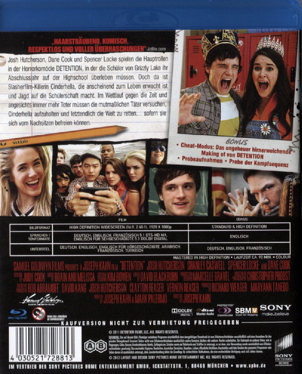 Josh Hutcherson, Dane Cook und Spencer Locke spielen die Hauptrollen in der Horrorkomödie DETENTION, in der die Schüler von Grizzly Lake ihr Abschlussjahr auf der Highschool überleben müssen. Doch da ist Slasherfilm-Killerin Cinderhella, die anscheinend zum Leben erwacht ist und Jagd auf die Schülerschaft macht. Im Wettlauf gegen die Zeit und angesichts immer mehr Toter müssen die mutmaßlichen Täter versuchen, Cinderhella aufzuhalten und letztendlich die Welt zu retten... sofern sie sich vom Nachsitzen befreien können.