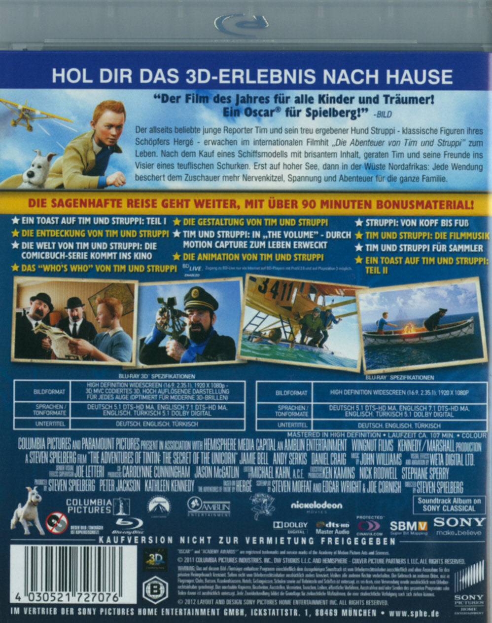 Enthält: Laufzeit Bonusmaterial: ca. 90 Minuten; Ein Toast auf Tim und Struppe: Teil 1; Die Entdeckung von Tim und Struppi; Die Welt von Tim und Struppi: Die Comicbuch-Serie kommt ins Kino; Das "Who's who" von Tim und Struppi; Die Gestaltung von Tim und Struppi; Tim und Struppi: In "The Volume" durch Motion Capture zum Leben erweckt; Die Animation von Tim und Struppi; Struppi: von Kopf bis Fuß; Tim und Struppi: Die Filmmusik; Tim und Struppi für Sammler; Ein Toast auf Tim und Struppi: Teil 2;