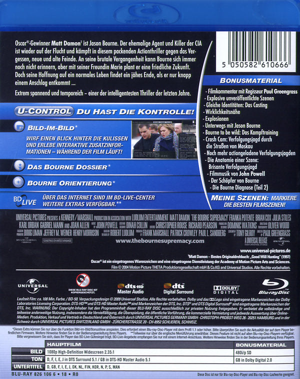 Enthält: Filmkommentar mit Regisseur Paul Greengrass (SD-Qualität); Explosive unveröffentlichte Szenen (SD-Qualität); Gleiche Identitäten: Das Casting (SD-Qualität); Wirklichkeitsnähe (SD-Qualität); Explosionen (SD-Qualität); Unterwegs mit Jason Bourne (SD-Qualität); Bourne to be wild: Das Kampftraining (SD-Qualität); Crash Cam: Verfolgungsjagd durch die Straßen von Moskau (SD-Qualität); Nochmehr actiongeladene Verfolgungsjagden (SD-Qualität); Die Anatomie einer Szene: Brisante Verfolgungsjagden (SD-Qualität); Filmmusik von John Powell (SD-Qualität); Der Schöpfer von Bourne (Teil 2/SD-Qualität); Die Bourne Diagnose (Teil 2/SD-Qualität); U-Control (Bild in Bild/HD-Qualität); Meine Szenen (HD-Qualität); BD-Live (My Scenes Sharing/HD-Qualität); Das Bourne Dossier; Bourne Orientierung;