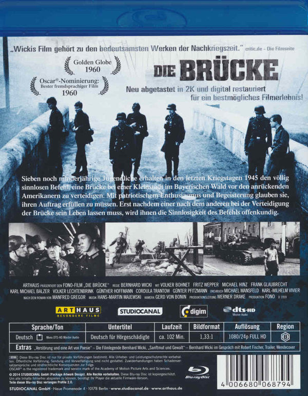 1945 kurz vor Ende des Zweiten Weltkriegs in einer deutschen Kleinstadt. Die amerikanischen Truppen rücken immer weiter vor. In dieser aussichtslosen Situation werden sogar Minderjährige rekrutiert und an die Front geworfen. Die meisten von ihnen sind schlecht ausgebildet und so grün hinter den Ohren, dass sie für sich und andere eine Gefahr darstellen. Sieben Schüler, teils in naivem Patriotismus gefangen oder von Abenteuerlust gepackt, sollen darum eine nutzlose Brücke gegen den Feind sichern. Zu ihrer Betreuung wird Unteroffizier Heilmann bestellt.