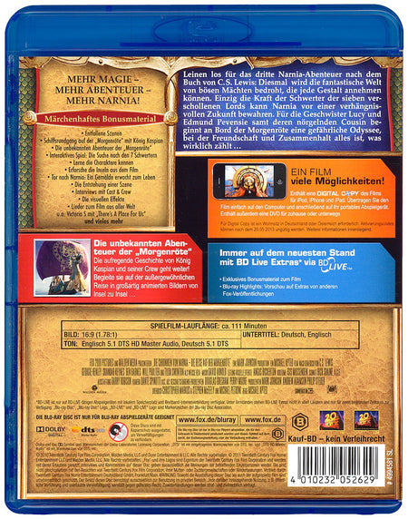 Digital Copy gültig bis 20.05.2013; BD Live Extras; Entfallene Szenen; Schiffsrundgang auf der "Morgenröte" mit König Kaspian; Die unbekannten Abenteuer der "Morgenröte"; Interaktives Spiel: Die Suche nach den 7 Schwertern; Lerne die Charaktere kennen; Erforsche die Insel aus dem Film; Tor nach Narnia: Ein Gemälde erwacht zum Leben; Die Entstehung einer Szene; Interviews mit Cast & Crew; Die visuellen Effekte; 8 Lieder zum Film aus aller Welt u.a. Victoria S. mit "There's A Place For Us";