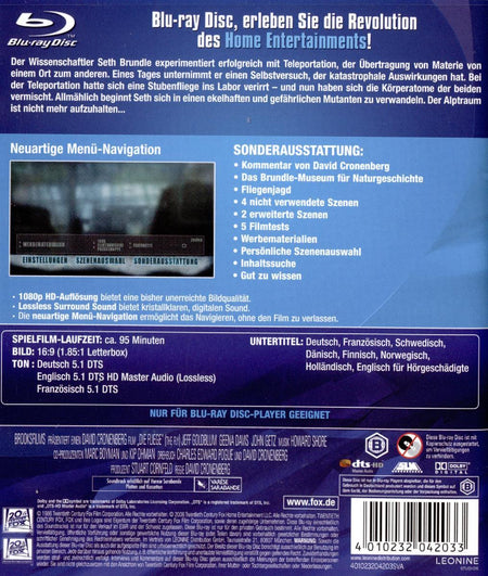 Enthält: Audiokommentar von David Cronenberg; Das Brundle-Museum für Naturgeschichte; Fliegenjagd; 4 nicht verwendete Szenen; 2 erweiterte Szenen; 5 Filmtests; Werbematerialien; Persönliche Szenenauswahl; Inhaltssuche; Gut zu wissen;