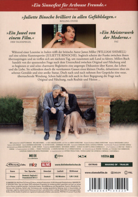 Auf einer Lesereise in Italien trifft der britische Autor James Miller eine franz�sische Kunstexpertin. Die beiden entschlie�en sich, am n�chsten Tag zu einem Ausflug in ein malerisches Dorf. Bereits w�hrend der Fahrt knistert es zwischen ihnen, sie sprechen �ber die Kunst, das Leben und die Liebe und geben sich f�r ein seit 15 Jahren verheiratetes Paar aus. Immer wieder stellt sich die Frage nach Wahrheit und Wahrnehmung, T�uschung und L�ge, Original und F�lschung. Spielen sie oder sind sie ein Paar, artikulieren sie nur eigene �ngste oder suchen sie eine Erkl�rung f�r ihr Scheitern?