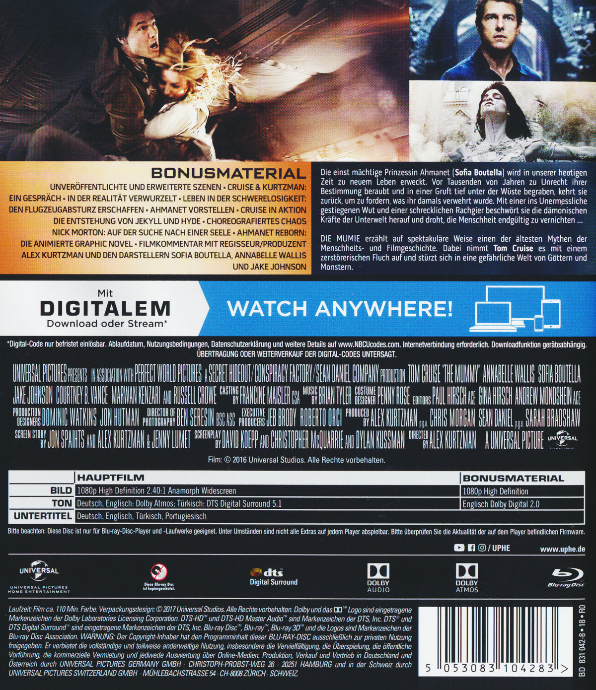 Enthält: Unveröffentlichte und Erweiterte Szenen; Cruise & Kurtzman: Ein Gespräch; In der Realität verwurzelt; Leben in der Schwerelosigkeit: Den Flugzeugabsturz erschaffen; Ahmanet vorstellen; Cruise in Aktion; Die Entstehung von Jekyll und Hyde; Choreografiertes Chaos; Nick Morton: Auf der Suche nach einer Seele; Ahmanet Reborn: Die animierte Graphic Novel; Filmkommentar mit Regisseur/Produzent Alex Kurtzman und den Darstellern Sofia Boutella, Annabelle Wallis und Jake Johnson;