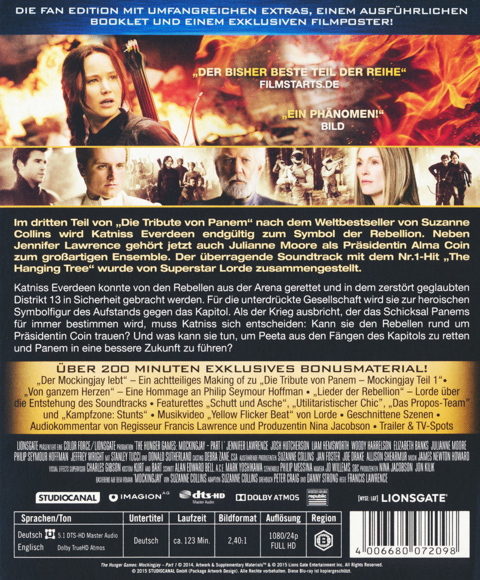 Enthält: „Der Mockingjay lebt“ – achtteiliges Making of zu "Die Tribute von Panem - Mockingjay Teil 1"; „Von ganzem Herzen“ – eine Hommage an Philip Seymour Hoffman; „Lieder der Rebellion“ – Lorde über die Entstehung des Soundtracks; Featurettes „Schutt und Asche“, Utilitarische Chic", "Das Propos-Team" und "Kampfzone: Stunts"; Musikvideo „Yellow Flicker Beat“ von Lorde; Geschnittene Szenen; Audiokommentar von Regisseur Francis Lawrence und Produzentin Nina Jacobson; TV-Spots; Trailer;